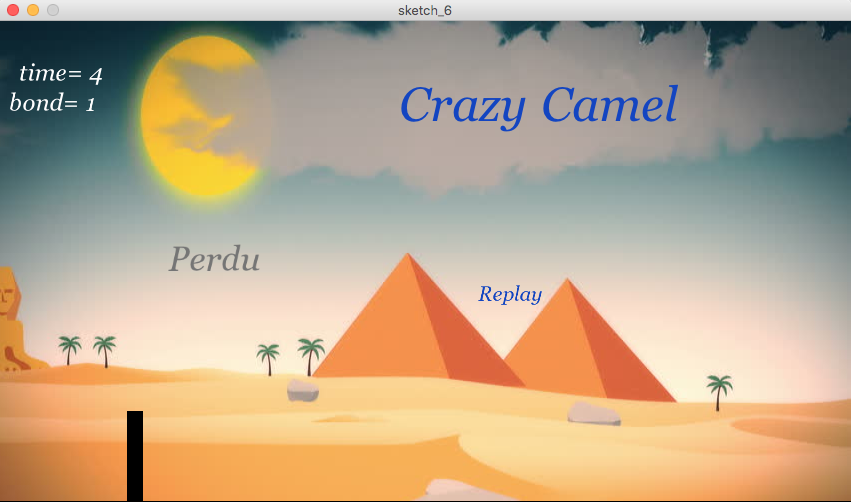 Aujourd'hui, nous avons corrigé un problème qui faisait disparaitre le dromadaire à 1cm de l'obstacle. Nous avons aussi augmenté la vitesse de l'obstacle en fonction du temps et revu la page d'accueil.