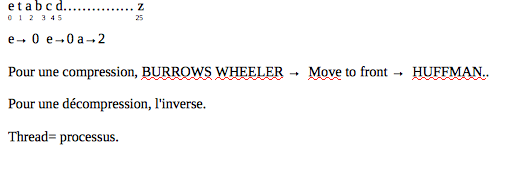 Le dictionnaire sera constitué d'un alphabet dont les lettres sont numérotées de 0 à 25, chaque fois qu une lettre est codée, elle subit un move to front dans le dictionnaire, elle passe en première place et prend le code 0.